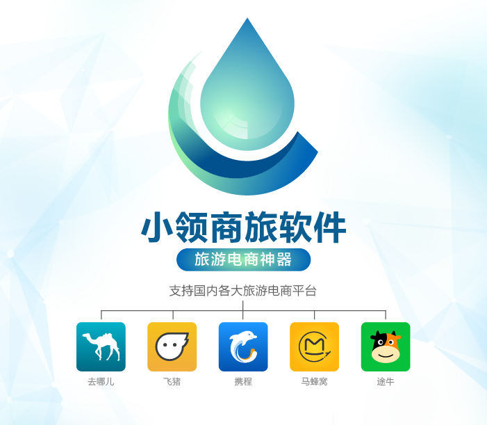 小領商旅軟件,旅游電商神器,國內各大旅游電商平臺(去哪兒,攜程,途牛,飛豬,螞蜂窩...)均可支持:機票集成,價格更新,排名分析,價格對比,做電商就是這么容易!。